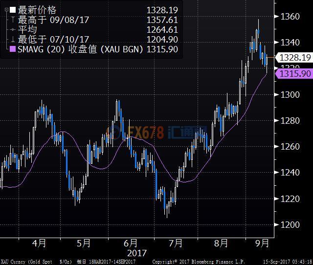 汇通网讯——金价周四(9月14日)触及20日均线所在的1316美元附近后,从两周低位反弹,黄金价格稍早走势波动,因交易员们权衡股市和美元下跌与美国通胀回升的各自影响,通胀可能会提升美联储加息的可能性。东北亚局势可能再次趋紧的消息短线推高金价。