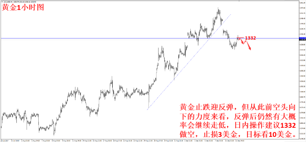 黄金止跌迎反弹,但从此前空头向下的力度来看,反弹后仍然有大概率会继续走低,日内操作建议1332做空,止损3美金,目标看10美金。