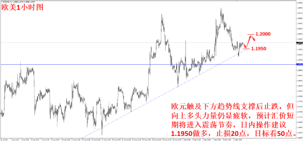 ' 欧元触及下方趋势线支撑后止跌,但向上多头力量仍显疲软,预计汇价短期将进入震荡节奏,日内操作建议1.1950做多,止损20点,目标看50点。