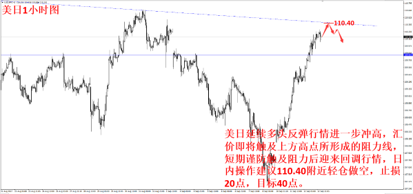 美日延续多头反弹行情进一步冲高,汇价即将触及上方高点所形成的阻力线,短期谨防触及阻力后迎来回调行情,日内操作建议110.40附近轻仓做空,止损20点,目标50点。