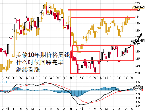 如何判断市场情绪是处于避险还是风险了,美债价格走势是一个很好的指标。当价格上涨的时候证明其受到市场追捧也就是说市场避险情绪比较高,反之下跌的时候证明市场风险情绪较高资金就去追逐风险资产了。就目前美债价格10年期周线来看价格已经是跳空朝上突破,不排除还会回踩的可能但是不跌破跳空的缺口那么就是看涨的走势。