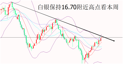 白银上周表现欲不是很强,最低在16.20,最高在16.70附近,收线高度就在16.70附近,上周提到的白银在16.70附近的高位做空,是预期的高空做空点,铜业那个也布置了高位做空的交易。目前从白银的收线来看,白银的高点还是保持在16.70-80的高位不变,在日线周期的趋势线之下或走一波较大的回落,还是看16.30-16.10为主,再结合非农数据的行情来看,看是否加大深度。本周的白银大区间放在17.10-15.60。周初还是先以16.70附近空单为主。日内具体操作可参考:16.70空持有,16.70-80继续空,16.10多。