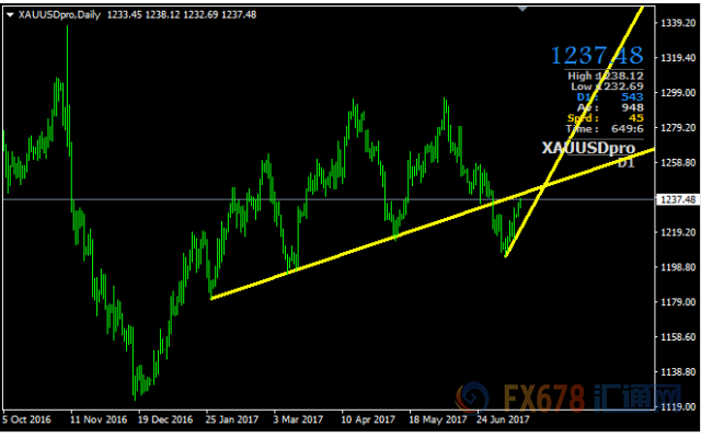 周二(7月18日)亚市盘中,黄金从1232.6' 美元/盎司短线冲高至1238.1美元/盎司,目前在1237.2美元/盎司附近徘徊,前期黄金大涨突破1225美元/盎司后,K线强势,短期趋势向上。