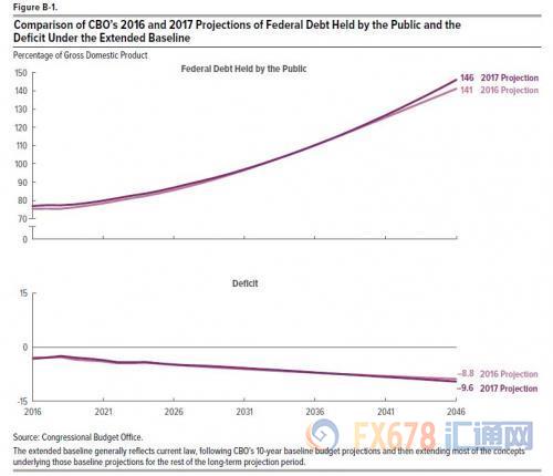 除了不断膨胀的债务之外,该办公室还预计,美国财政赤字占GDP的比例将由2017年的2.9%上升到2047年的9.8%。截止至2016财年年底,美国的财政赤字为5870亿美元。