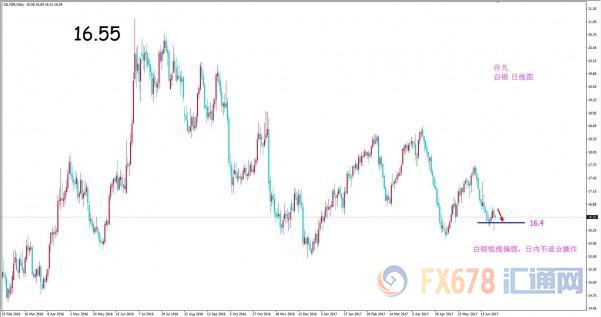 nload=imgresize(this); >白银昨天以长下引线的阴柱收尾,虽然说没有吞没前几个交易日的涨幅,但是早间开盘还是运行在日线10日均线下方,所以日内白银趋势还是有点偏弱,那么接下来就以10日均线16.6为日内压制看回落,下方先看16.4的低点支撑,破位之后,再去看昨天16.2的低点。对于今天的操作,其实不建议短线去操作的,毕竟日线的走势并不是很明显的看跌走势,只是要在16.6的压制下走一波回落。