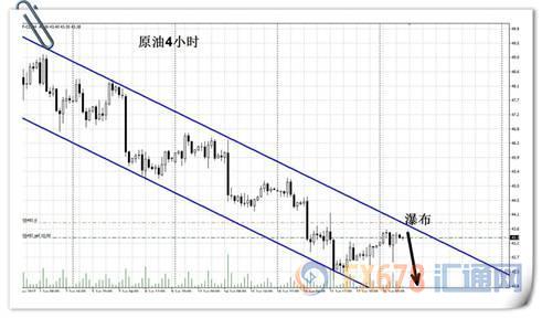 最后,说一下' 原油,周一反弹高点43.60,这也是昨天策略空的位置,最低点42.6,这个波动在原油的行情当中不算太大,不过,位置昨天我的策略卡的还是很完美,凌晨价格以42.6反弹上来,今天,其实我还是看空,我预计很快,很快就会出现瀑布,暴跌是油市当中的常态,今天要做空原油在43.4-43.5的位置,以4小时阴K线顶点的位置来操作,目前价格已经靠近4小时下降通道上轨的位置了。