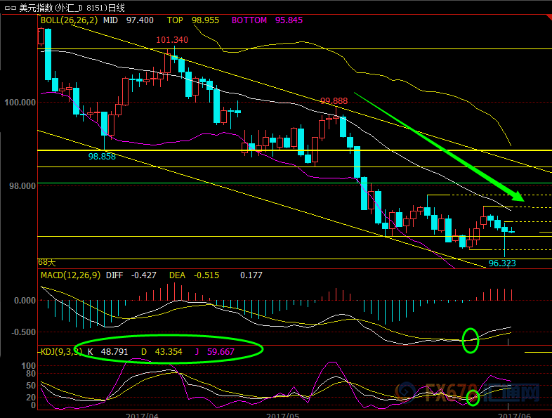 结论:中线下行风险仍存,短线需观望,若收盘站在97.50上方,则暗示美元初步见底;若收盘于96.80下方,则暗示美元仍有较大可能会延续跌势。