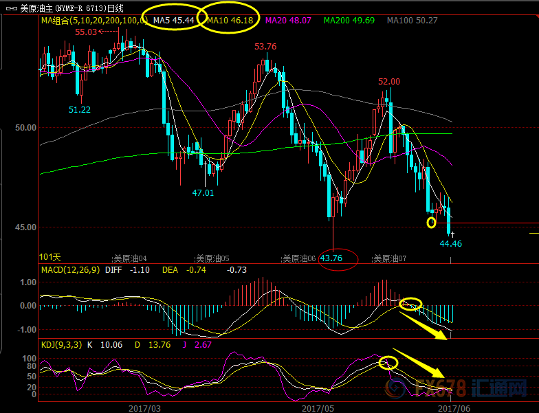 从日线来看,均线空头排列,MACD死叉良好运行,KDJ死叉运行至超卖区,但仍有向下发散的迹象,短线油价仍有一定的下行风险,关注5月5日低点43.76附近的支撑,2016年11月11日低点支撑在42.20附近。上方关注上周低点45.20附近阻力和5日均线45.44附近阻力,强阻力在10日均线46.18附近。