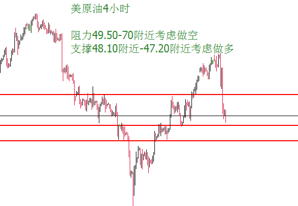 多的不谈,说下原油的看法思路。因为是消息不及公布预期的下跌但是总归是完成了延长减产。简单粗暴点说美原油回撤先关注的支撑是48.10附近然后看47.20附近位置,基本回撤到支撑会考虑做多一次的机会。阻力则是关注49.50-70附近,若是没有回撤直接上涨那么则考虑在其位置做空。
