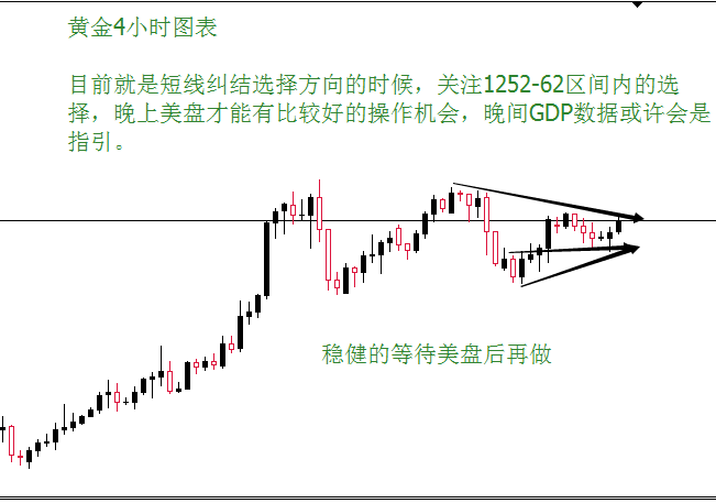 等待的黄金选择方向,而不是说目前就能判断朝着那个方向去走,就目前的短线技术面来看能够朝上突破站上1262那么后面还有机会去测试到1278-80附近位置。反之测试跌破1250-52附近位置就是到1237附近的机会。换个思路而言就是守住了1260-62的阻力就是看跌反之就是看涨。