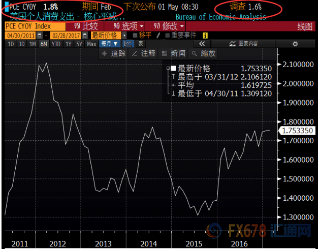 上周五(4月28日)出炉的美国一季度GDP表现不佳,录得三年来最低水平,料在日内仍会对美元有所拖累,但分项数据美国一季度核心PCE增长了2%,为一年来最高水平,亦高于近五年来平价水平,从这方面来看,晚间的PCE数据可能表现不会太差。