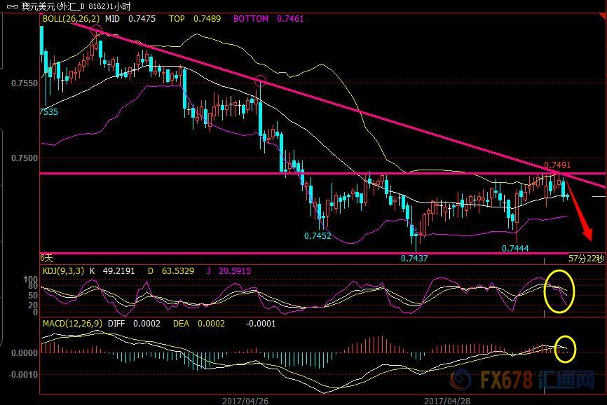 汇通网交易策略:逢高做空,0.7512附近布局空单,止损在0.7550上方,止盈0.7440附近;若跌破0.7430,激进投资者可考虑追空,止损在0.7450上方,止盈0.7305。