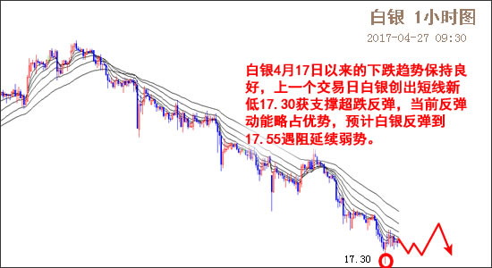 白银日线图也以震荡回调格局运行,当前回调动能仍然略占优势。从小时图走势来看,白银4月17日以来的下跌趋势保持良好,上一个交易日白银创出短线新低17.30获支撑超跌反弹,当前反弹动能略占优势,预计白银反弹到17.55遇阻延续弱势。白银短线阻力17.65,支撑17.30。