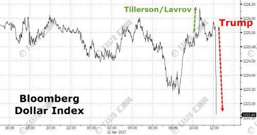 美国主流财经媒体的美元指数走势可见,本周三,在美国国务卿蒂勒森与' 俄罗斯外长新闻发布会后,该指数一度反弹,刷新日内高位,而特朗普讲话后,该指数直线跳水。