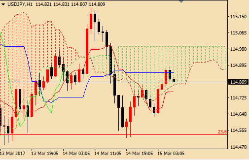 nload=imgresize(this); >解析:美元兑日元盘中小幅反弹至115关口附近。小时图汇价倾向上涨,上方初步阻力位于115.20附近,日线级别汇价目前看震荡,因云层走势趋平,市场或在美联储决议之后选择方向,决议前,倾向逢低做多。