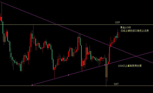 2)技术上,昨日午夜收线的黄金日线形成一根带有较长上下影线的十字K,1217一线成为短周期底部,1237一线为短周期上档压力位。今日早盘的日K线末端录得近似光头光脚的中阳线,且KD金叉向上,显示短周期多头力量已经占据优势。黄金4小时级别和1小时级别K线短周期呈多头排列,价格已经上破收敛三角形上边界,有进一步上攻1237一线压力位的能量,短周期黄金价格呈现弱势偏多态势。