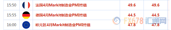 时间指标前值预测值14:00德国3月实际零售销售月率0.5-0.514:30瑞士3月实际零售销售年率-0.2-0.415:50法国4月Markit制造业PMI终值49.649.615:55德国4月Markit制造业PMI终值44.544.516:00欧元区4月Markit制造业PMI终值47.847.819:00英国央行公布利率决议、会议纪要及通胀报告。19:30英国央行行长卡尼召开新闻发布会19:30美国4月挑战者企业裁员人数6.0620:30美国截至4月27日当周初请失业金人数2321.522:00美国3月耐用品订单月率终值2.722:00美国3月工厂订单月率-0.51.5
