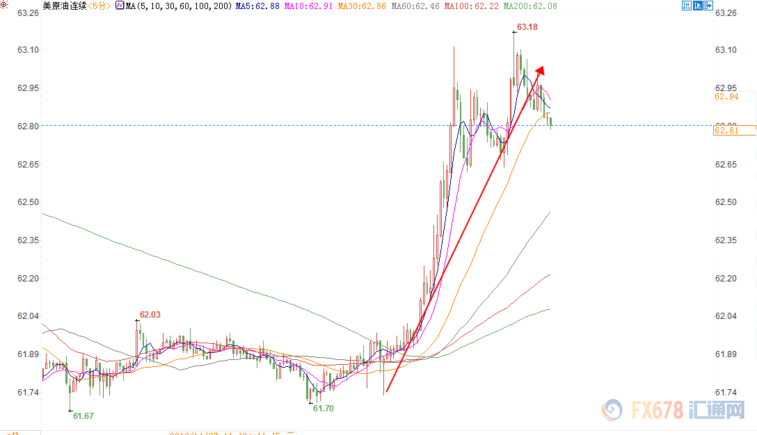 不过需注意的是,今日北京时间17:50左右据塔斯社援引消息人士称,俄罗斯与沙特正在讨论与2019年进行石油减产。消息公布后,美布两油短线双双飙升逾1' 美元,美油刷新日内高点至63.18美元/桶,布油涨近2%,创近二日新高至73.55美元/桶。因此晚间开盘,INE原油或出现一波跳涨行情。