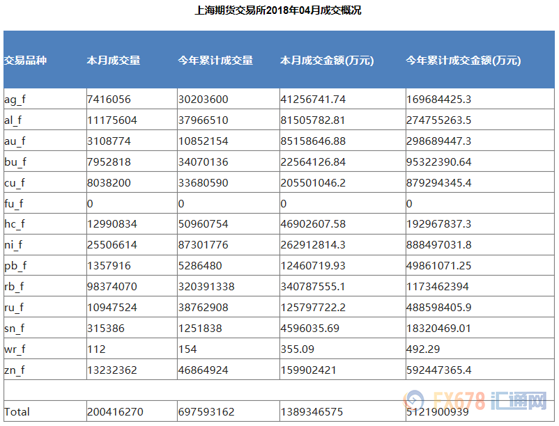 汇通网讯——上海期货交易所2018年5月4日举行新闻发布会,在第一部分的主动发布中,上期所发布了2018-2022年度战略规划。第二部分的市场成交概况中,对这些商品的成交情况做了数据统计展示:INE原油期货、黄金、白银、石油沥青、天然橡胶、燃料油、铜、铝、锌等商品。
