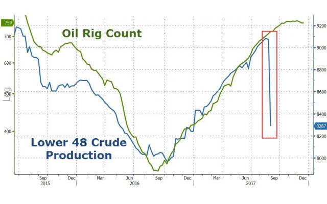 nload=imgresize(this); >由于在飓风的影响下,美国得州大部分' 原油开采停止,美油产量本周暴跌,滞后的活跃油井数通常会跟随WTI油价的轨迹稳定下来,截至9月8日当周的贝克休斯数据显示美国活跃油井数下降3口至756口,创6月份以来的最低水平。