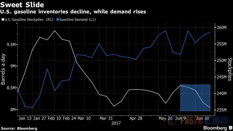 上周,' EIA的数据显示,截止7月7日当周,美国原油库存下滑756万桶,创下了9月以来最大跌幅。汽油供应连续第四周出现下滑,跌至去年12月以来的最低水平,而需求每天增加8.1万桶。
