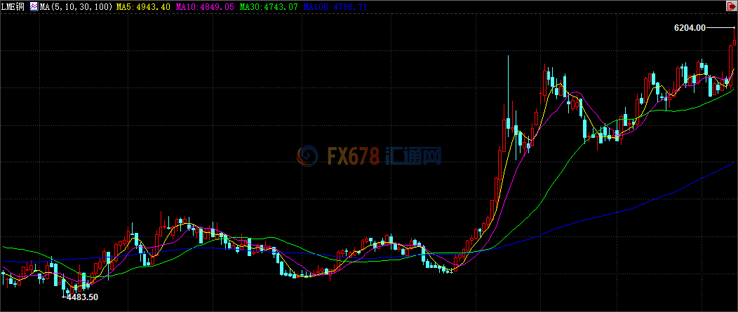 伦敦金属交易所(LME)三个月期铜盘中触及6204美元,收涨0.3%,报6106美元。