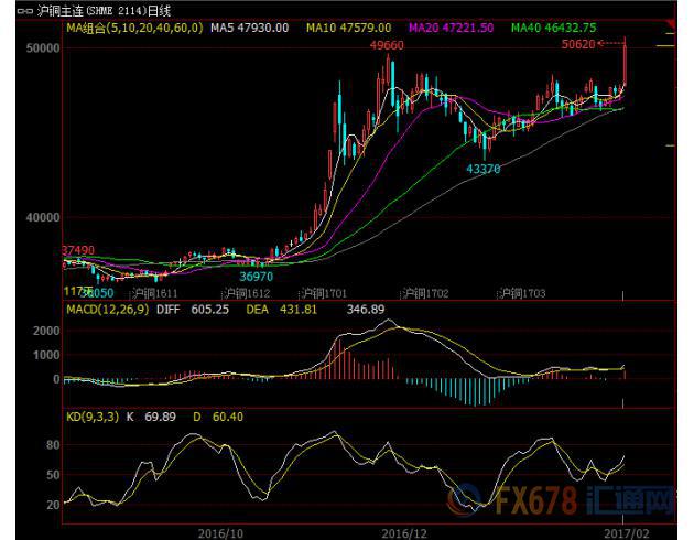 汇通网讯——2月13日沪铜主力合约收涨逾5%,报50120元/吨,为两年半来最高收盘位,盘中最高触及50620元/吨,亦为两年半新高;因全球两大铜矿遭遇发货困难,令供应担忧席卷市场。目前铜价仍有上涨动能,后市有望继续冲高。
