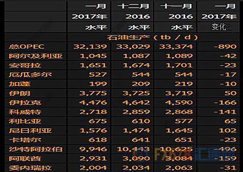 石油输出国组织(' OPEC)周一(2月13日)公布了月度' 原油市场报告。据二手资料显示,OPEC组织1月原油总产量减少89.02万桶/日,1月原油产量为3213.9万桶/日,因产油国执行减产协议。且月报暗示,2017年全球石油市场料将不会供应过剩,此前暗示供应过剩98.5万桶/日。