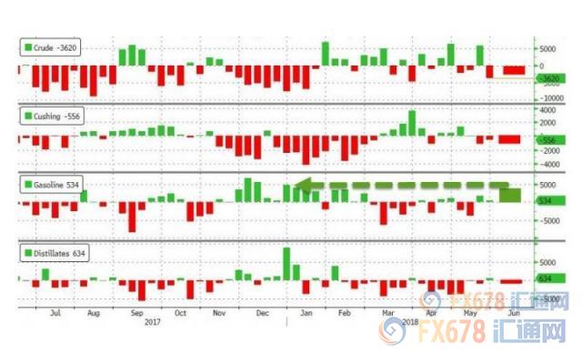 nload=imgresize(this); >图:6月1日当周API原油库存数据概览(注:右边数字为刻度,不是数据)API公布,截至6月1日当周,美国原油库存减少200万桶,至4.328亿桶,分析师预估为减少250万桶。库欣原油库存减少13.2万桶。