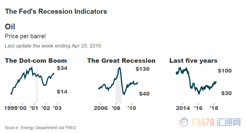 目前,因' OPEC实施减产协议,油价处于上升趋势。下图给出了三个时期的油价,分别是美国互联网泡沫时期、美国大衰退(2006年到2010年金融危机)时期以及过去5年的石油价格。从图中可以看出,2008年金融危机爆发前夕,油价曾一度触及130' 美元/桶的高位,此后油价回落,一度跌至30美元下方。而近期油价再次反弹,曾一度触及三年半新高。