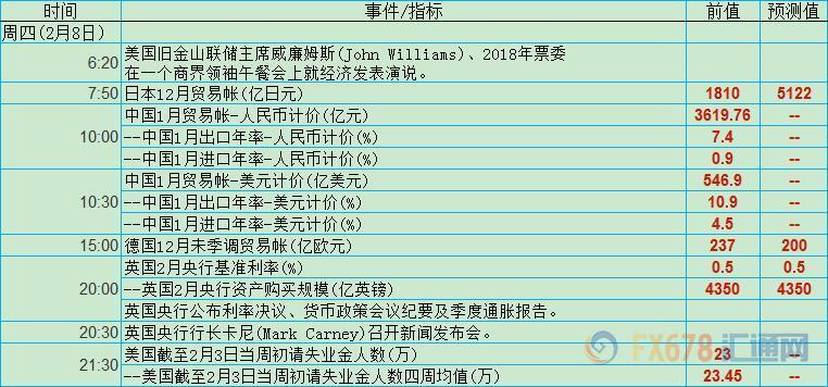 周四(2月8日)关键词:威廉姆斯讲话、中国贸易帐、英国央行利率决议