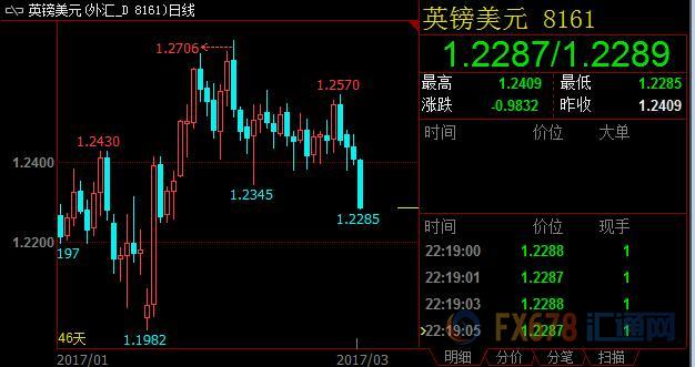 截止发稿,英镑兑美元交投于1.2293,暴跌0.93%,日线上看,汇价下破颈线位1.2345,自2月初以来已构筑起倒N形态;欧元兑美元交投于1.0525,大泻0.65%。