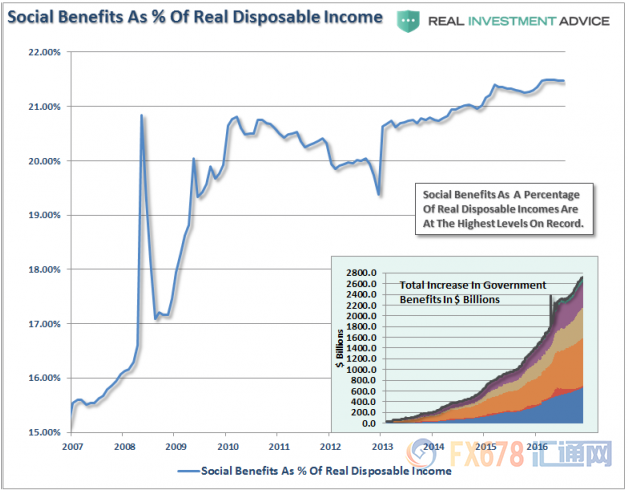 目前,高达70%的美国经济产出依赖个人消费,但不幸的是,用于维系此等高消费水平近22%的个人收入来自于政府转移支付。