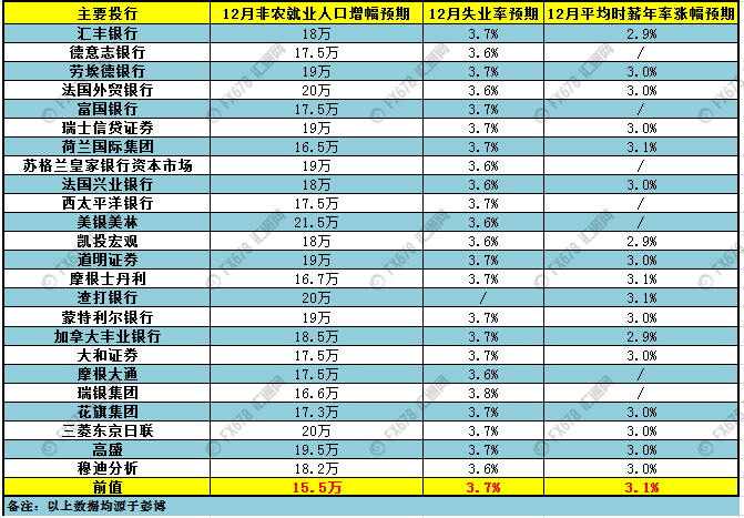 汇通财经指出,24家大型投行预测显示,各投行对于美国12月非农就业人口增幅的预期较为乐观,具体来看,美国12月季调后非农就业人口增幅料介于16.5万-21.5万,失业率料介于3.6%-3.8%,平均时薪年率增幅料介于2.9%-3.1%。
