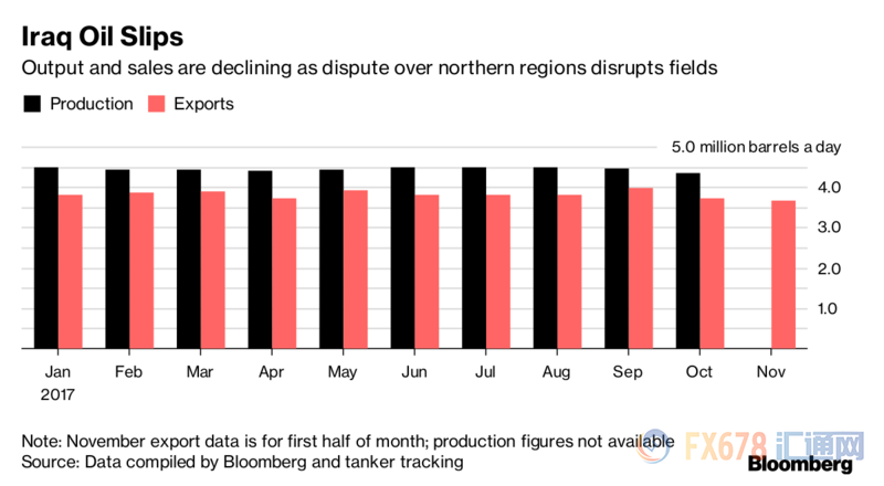 伊拉克的石油产量持续一年超过产量配额后,在10月份出现了暴跌。当时,伊拉克的联邦军队,以及半自治的库尔德地区武装分子之间发生冲突,破坏了有争议的基尔库克省油田。油轮跟踪数据显示,尽管冲突已经平息,但伊拉克北部油田11月上半月的石油出口量仍比冲突发生前少了40%。