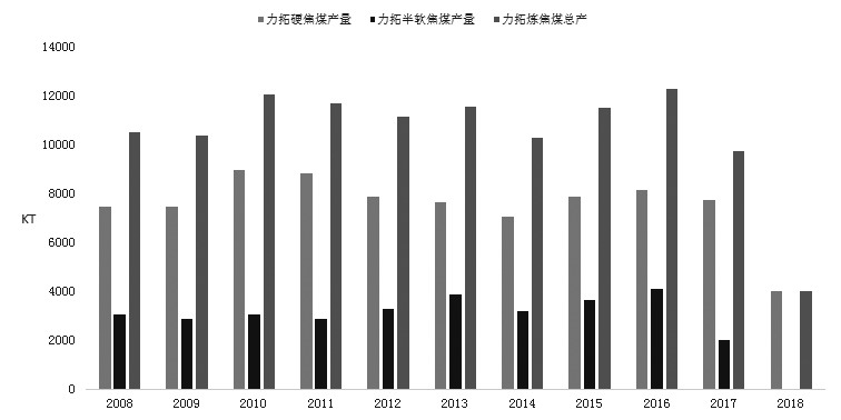 图为力拓硬焦煤、半软焦煤、炼焦煤产量变化