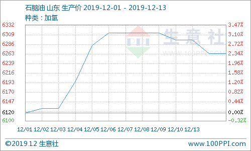 截止到12月13日国内地炼加氢石脑油主流出厂均价为6263.33元/吨,较周初6313.33元/吨下跌0.79%,地炼加氢石脑油实际成交价格在6300元/吨左右。