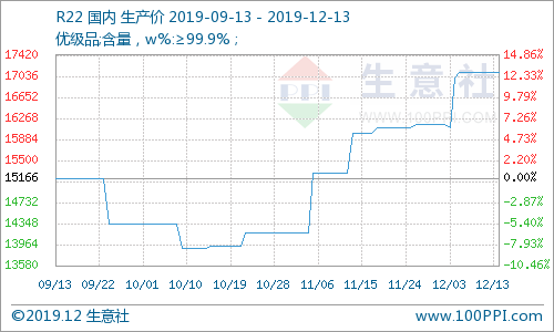 根据生意社价格监测,本周国内制冷剂R22出厂价格平稳运行,12月09日主流厂家价格均价17100元/吨,周末(13日)均价17100 元/吨,本周行情持稳运行,12月15日R22商品指数为102.60,与昨日持平,创下周期内的历史新高,较2019年10月14日最低点83.40点上涨了23.02%。(注:周期指2019-09-01至今)