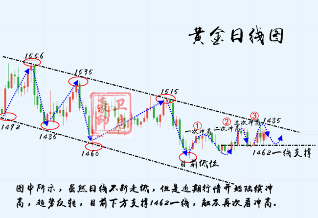 黄金1470美金做多,止损1465美金,目标1480,1485美金。