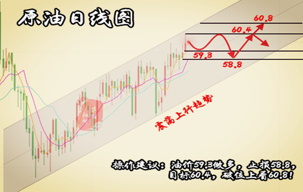 操作建议:油价回落59.3做多,止损58.8,目标60.4,破位上看60.8!反之追一波空单,激进者现价60可短空,但是利润空间不大,需控制好仓位。