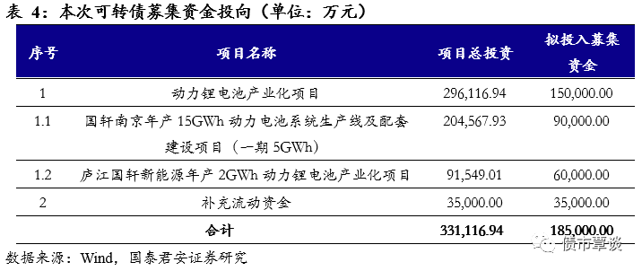 公司本次发行可转债拟募集资金总额不超过18.50亿元,将主要用于动力锂电池产业化项目和补充流动资金,其中动力锂电池产业化项目分为国轩南京年产15GWh动力电池系统生产线及配套建设项目(一期5GWh)和庐江国轩新能源年产2GWh动力锂电池产业化项目。