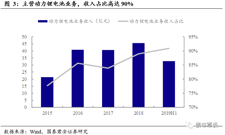 深耕动力电池行业十余载,产销量位居全国前列。2019年上半年,公司动力锂电池业务实现收入32.79亿元,同比增长48.72%,占总营收比重为90.92%。公司动力电池以磷酸铁锂为主,根据高工产业研究院 (GGII)统计,2019 年 1-6 月公司动力电池装机量为 1.76GWh,其中磷酸铁锂产品占比 89.02%。同时,公司自主开发的三元电芯产品已完成设计验证并实现量产,随着公司三元电池生产线升级改造的完成以及下游客户新车型陆续上市,未来公司三元电池占比将逐步提升。2019年上半年,公司动力锂电池市场占有率为5.87%,较2018年年末提升0.49个百分点。近年来,公司稳居国内动力电池企业装机量排名前三名,仅次于宁德时代和比亚迪。除新能源汽车外,公司动力锂电池组产品还可广泛应用于储能电站、通讯基站、风光互补、移动电源等领域。