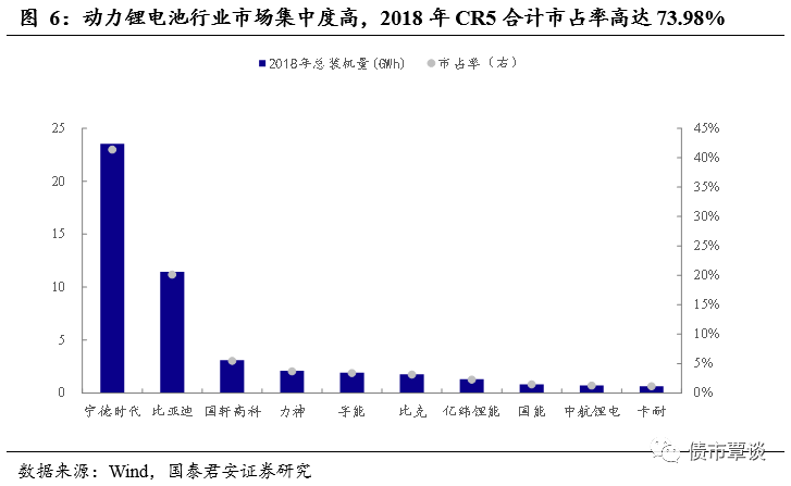 动力锂电池行业集中度高。根据动力电池应用分会研究部统计数据,2018全年我国新能源汽车动力电池装机总量为56.89GWh,同比增长56.88%。其中宁德时代以23.43GWh的装机量遥遥领先,市占率高达41.38%。排名第2-5的企业分别为:比亚迪、国轩高科、力神和孚能,五家合计装机量为42.09GWh,CR5合计市占率高达73.98%,市场集中度非常高。