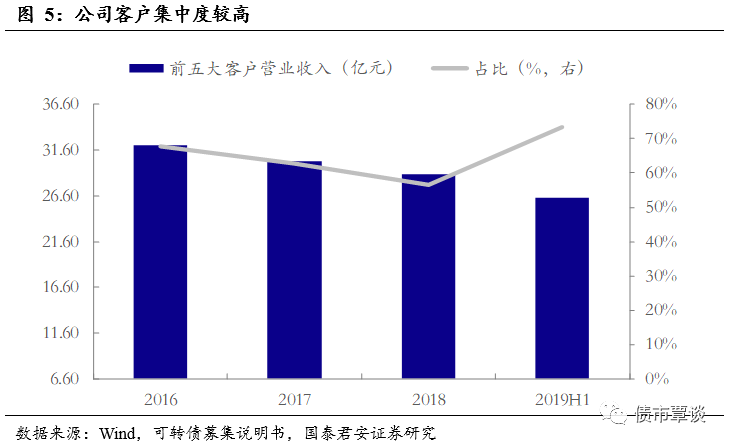 公司客户集中度较高。2016至2018年,公司前五大客户占当期营业收入比重呈下降趋势,但整体仍处在高位,分别为67.64%、62.74%和56.55%。公司对前五大客户的营收额在逐年下降,2019年上半年下降至26.44亿元,原因系2019年新能源汽车补贴大幅退坡导致下游端需求下降所致。但在对前五大客户营业收入额逐渐下降的背景下,2019年上半年的前五大客户营收占比出现大幅提升,达到73.31%,这反映出公司对其大客户的依赖程度极高,在行业低迷时尤其明显。公司客户主要为江淮汽车、北汽新能源、中通客车、上汽大通、上海申龙客车等国内知名新能源汽车制造商。