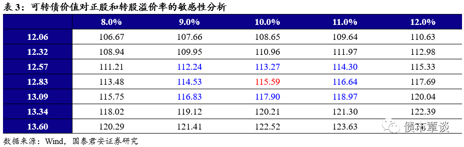 【条款分析】本次可转债发行期限6年,票息为递进式(0.4%,0.6%,1.0%,1.5%,1.8%,2.0%),到期回售价为110元(含最后一期利息)。主体评级为AA,转债评级为AA,按照6年AA中债企业债 YTM 4.93%计算,纯债价值为86.24元,YTM为2.45%。发行6个月后进入转股期,初始转股价12.21元,12月13日收盘价为12.83元,初始平价105.08元。条款方面,15/30+85%的下修条款,15/30+125%的有条件赎回条款,30/30+70%的回售条款。可转债潜在稀释比率约为13.33%。