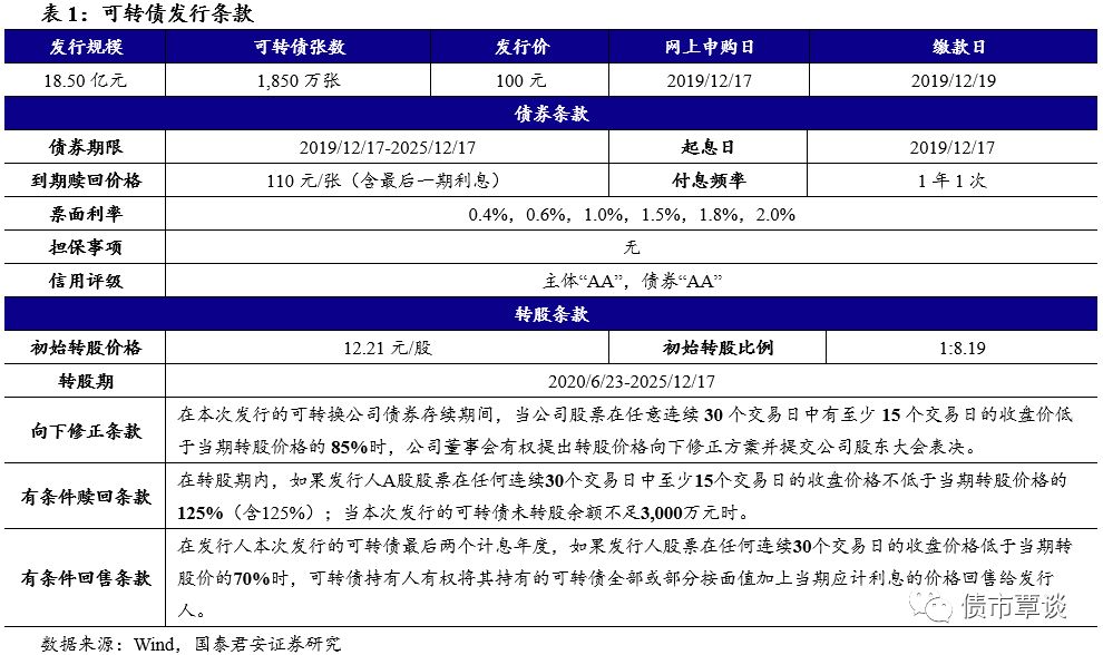 发行信息:本次转债发行规模为18.50亿元,网下申购日期为2019年12月16日,网上申购及原股东配售日为2019年12月17日,网上申购代码为“072074”,缴款日为12月19日。公司原有股东按每股配售1.632元面值可转债的比例优先配售,配售代码为“082074”。网下发行申购上限为10亿元,网上发行申购上限为100万元,联席主承销商海通证券和招商证券最大包销比例为30%,最大包销额为5.55亿元。