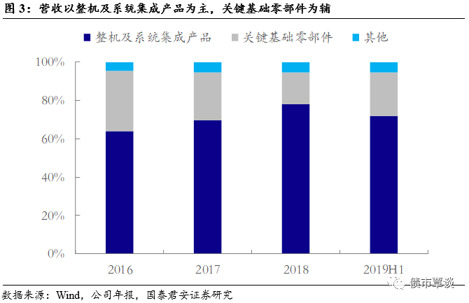 营收以整机及系统集成产品为主,关键基础零部件为辅。从公司的营收结构变化来看,2016年至2018年整机及系统集成产品在公司的营收占比逐年提升,2018年占比增长至78%。相比之下,关键基础零部件的营收占比逐年减小。2019年上半年,公司整机及系统集成产品销售状况欠佳,导致收入增速下降至-21.24%,而关键零部件业务表现亮眼,同比增速上涨至14.59%,因此导致整机及系统集成产品的营收占比在2019年有所下滑。
