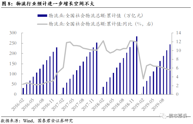物流业板块预计增长空间较小,但物流自动化相关业务仍是亮点。从全国社会物流总额累计值同比增速来看,当前物流总额累计值基数已经高达244万亿元,增速在5.57%左右,预计明年进一步增长空间较小。但目前物流自动化程度较低,物流自动化相关业务仍是看点。新北洋的物流自动化的相关业务在2019从三季度开始已经逐步在形成规模,明年该项业务或将成为一个新的增长点。