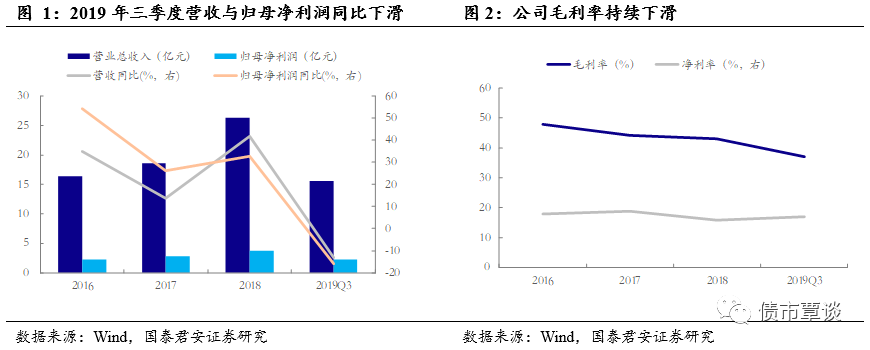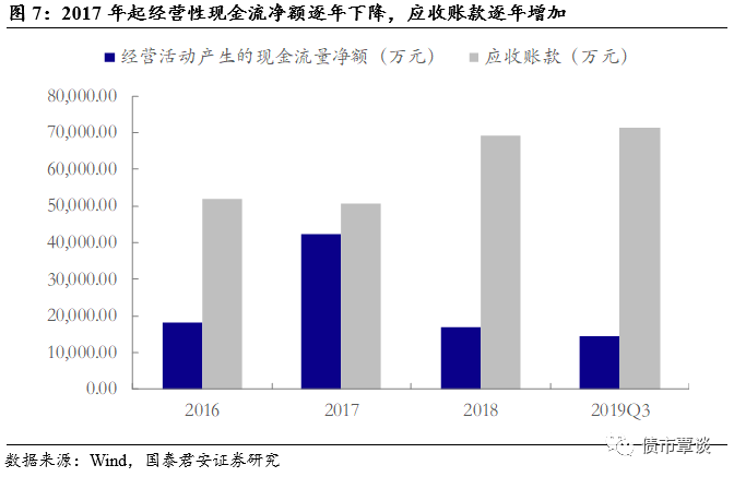 2017年起经营性现金流逐年下降,应收账款逐年增加。公司2018年经营性现金流净额为17,010万元,较2017年大幅下降25,255万元;2018年应收账款为69,289万元,较2017年大幅上涨18,564万元。公司经营性现金流大幅下降原因主要为,生产备料采购支付货款增加和销售回款率同比下降。2019年前三季度,公司经营性现金流与应收账款在数额变化上延续了2018年的趋势,经营性现金流净额为14,415万元,应收账款为71,453万元。