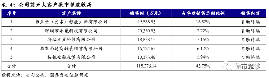 公司前五大客户集中度较高,且均为自助终端产品销售商。2018公司前五大客户销售额的年度销售额占比高达43.75%,较2017的27.1%有大幅提升,主要原因为公司在2018年获得了招商局通商融资租赁有限公司这一新客户,同时2017年的客户养生堂、浙江丰巢、招银金融租赁在2018年向公司进行了大量的自助终端采购。公司新客户的获取,主要源于公司在新零售业务的布局,加之新零售客户对具有自动结算商品金额、接受现金支付/移动支付等方式进行客户自助付款的自助终端的需求增加。